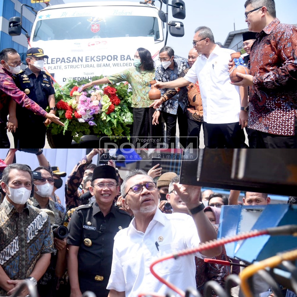 CIKARANG BARAT – Pj. Bupati Bekasi, Dani Ramdan mendampingi Menteri Perdagangan, Zulkifli Hasan, melakukan pelepasan ekspor 3.800 metrik ton baja struktur dan plat baja ke Selandia Baru, hasil produksi PT. Gunung Raja Paksi, Tbk. di Cikarang Barat.