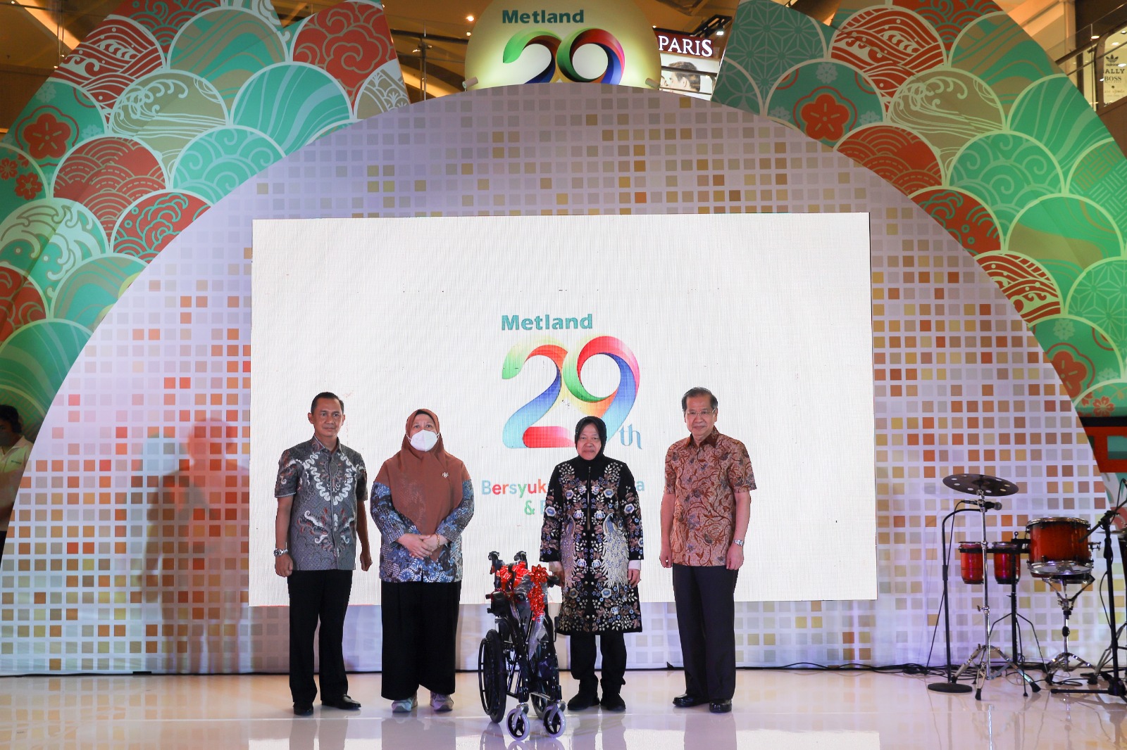 Penyerahan kursi roda secara simbolis dilakukan oleh Presiden Direktur PT Metropolitan Land Tbk, Anhar Sudradjat kepada Menteri Sosial Republik Indonesia, Tri Rismaharini di main atrium Grand Metropolitan, Kamis (16/2/2023).