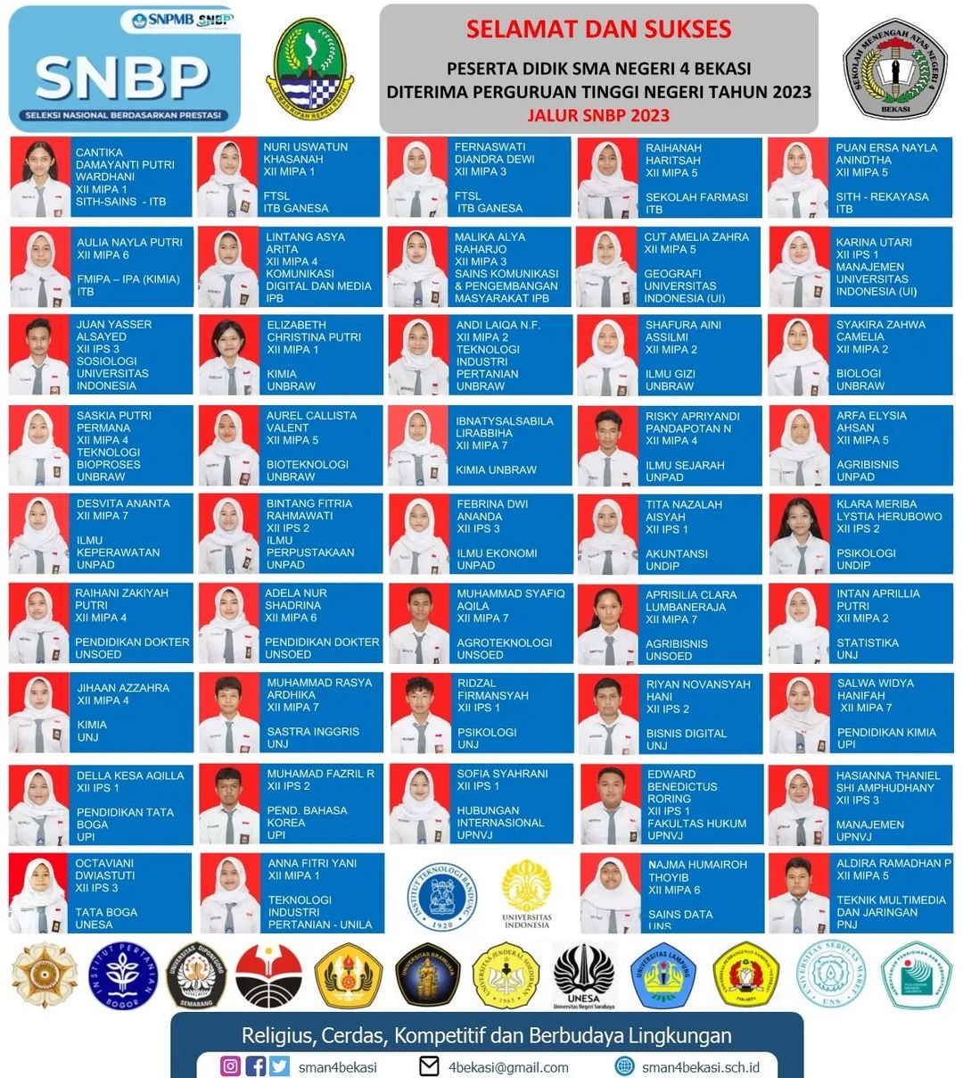 “Ada 44 siswa SMAN 4 kota Bekasi yang diterima di PTN melalui yang mengikuti SNBP tahun ini, dan yang mengikuti seleksi sekitar 143 siswa, 100 siswa IPA dan 43 siswa IPS. dengan tingkat kelulusan 30,7%,”jelas Trisnani Wakasek Humas Trisnani S.Pd Rabu (10/05/23)
