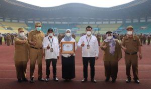 Penyerahan penghargaan dilakukan oleh Plt. Wali Kota Bekasi didampingi juga oleh Pj. Sekretaris Daerah, Taspen, dan Ketua Korpri Kota Bekasi.