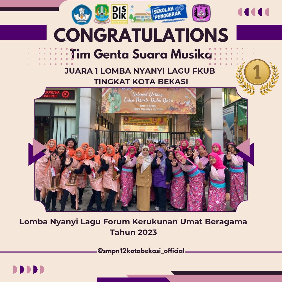 BEKASI SELATAN – Seluruh warga SMPN 12 Kota Bekasi patut berbangga. Ya, tim paduan suara Genta Suara Musika berhasil meraih juara 1 lomba lagu kerukunan umat beragama tingkat Kota Bekasi.