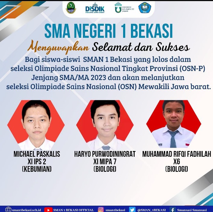 BEKASI SELATAN – Tiga siswa SMAN 1 Kota Bekasi berhasil melaju ke ajang Olimpiade Sains Nasional (OSN) tingkat nasional. Ketiga siswa tersebut adalah Haryo Purwodiningrat dari kelas XI MIPA 7, Muhammad Rifqi Fadhilah dari kelas X 6, dan Michael Paskalis dari kelas XI IPS 2.