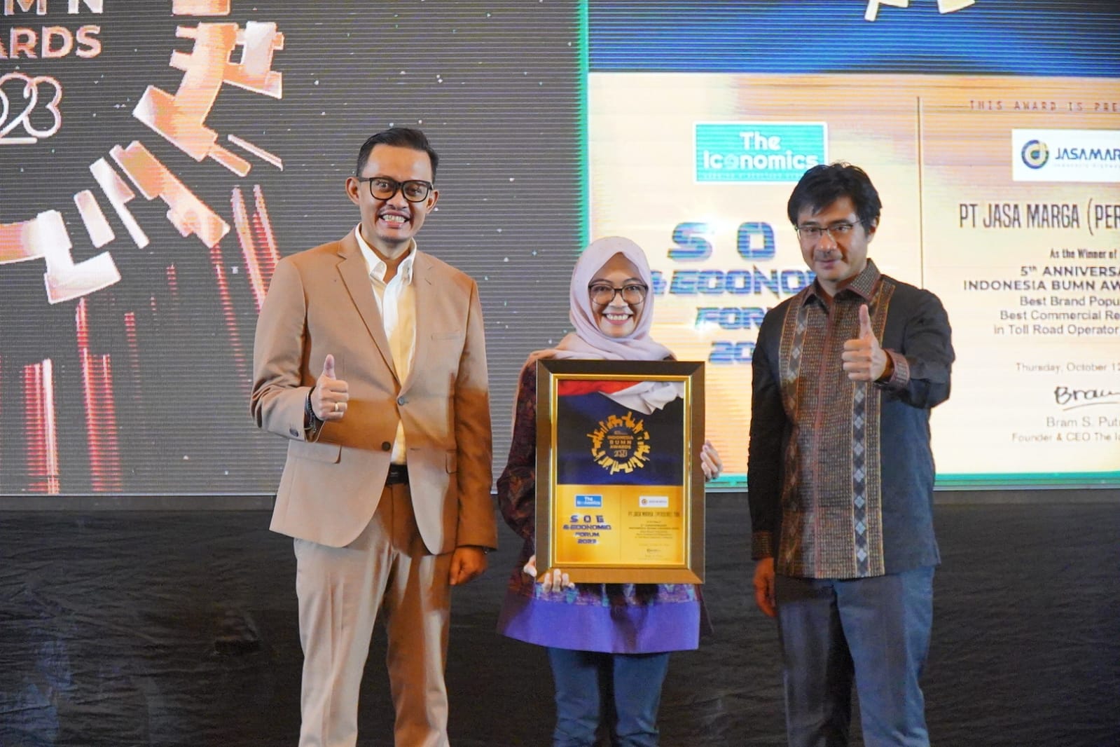 Jakarta, (13/10), PT Jasa Marga (Persero) Tbk berhasil meraih penghargaan di ajang 5th Anniversary BUMN Awards 2023 untuk kategori “Best Brand Popularity in Toll Road Operator Category” dan “Best Commercial Reputation in Toll Road Operator Category” yang diselenggarakan oleh The Iconomics Media, Kamis (12/10).