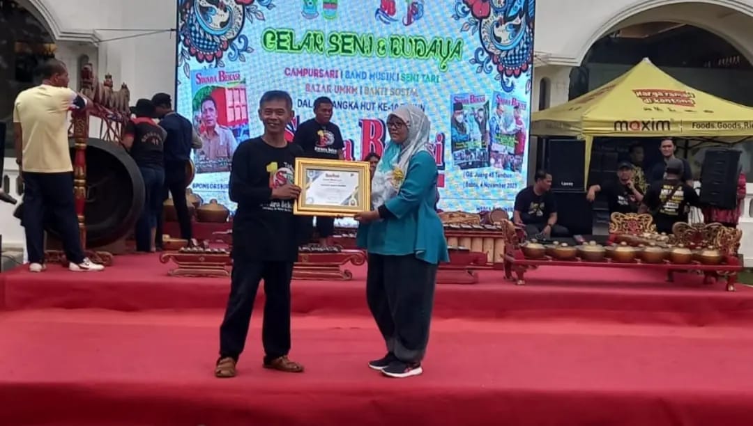keterngan foto Ketua Pelaksana HUT Swara Bekasi Tarmin memberikan pigam ucapan terima kasih kepada Ketua sanggar Wijaya Kusuma Riati Ninghsih dan