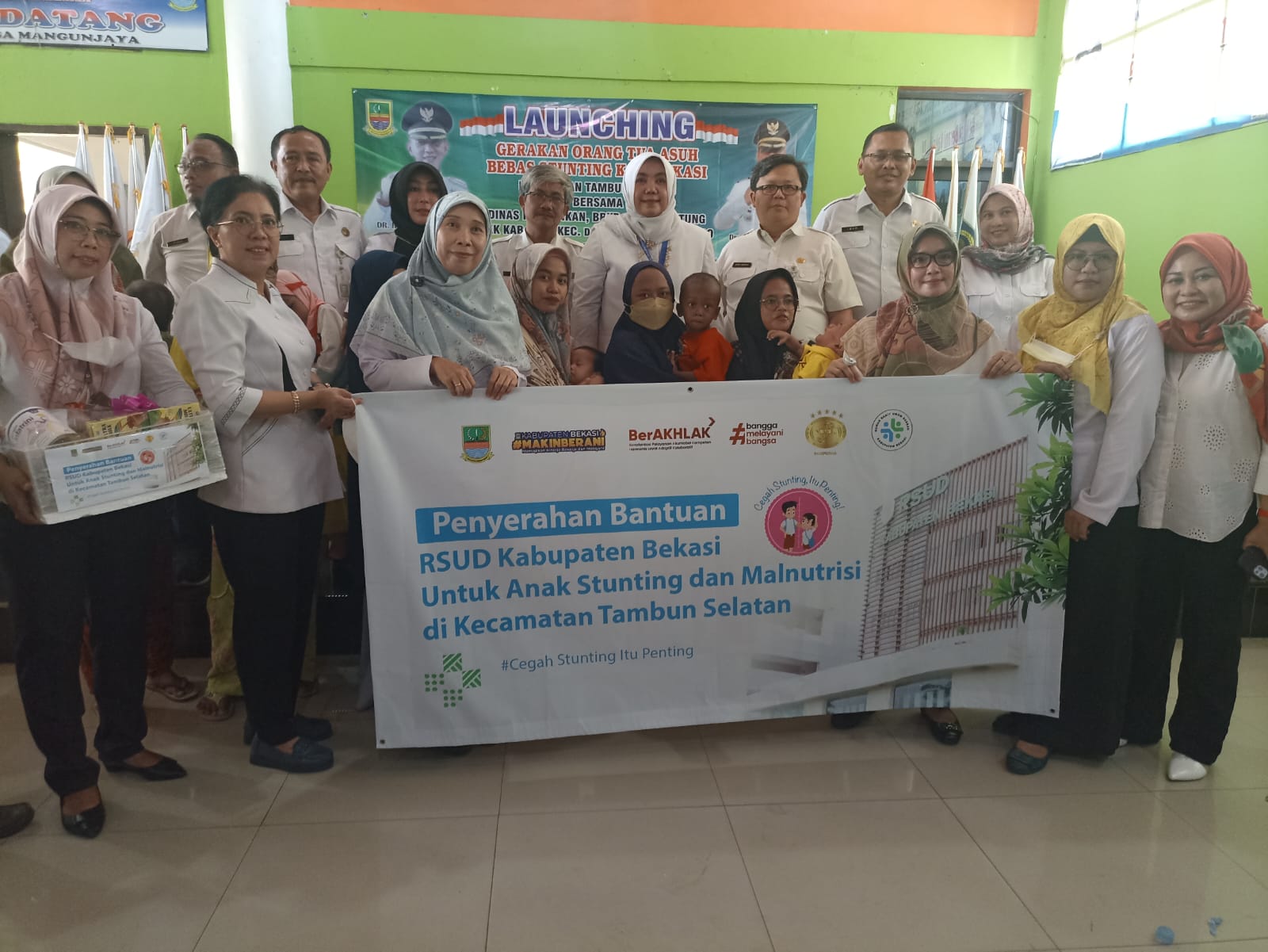 TAMBUN SELATAN – Dinas Pendidikan dan Rumah Sakit Umum Daerah (RSUD) Kabupaten Bekasi (Cibitung) menjadi Tim Liaison Officer (LO) sebagai Program Bapak Asuh Anak Stunting (BAAS) dengan menyalurkan bantuan untuk menekan angka stunting kepada masyarakat yang ada di wilayah Desa Mangunjaya, Kecamatan Tambun Selatan pada Rabu (20/12/2023).