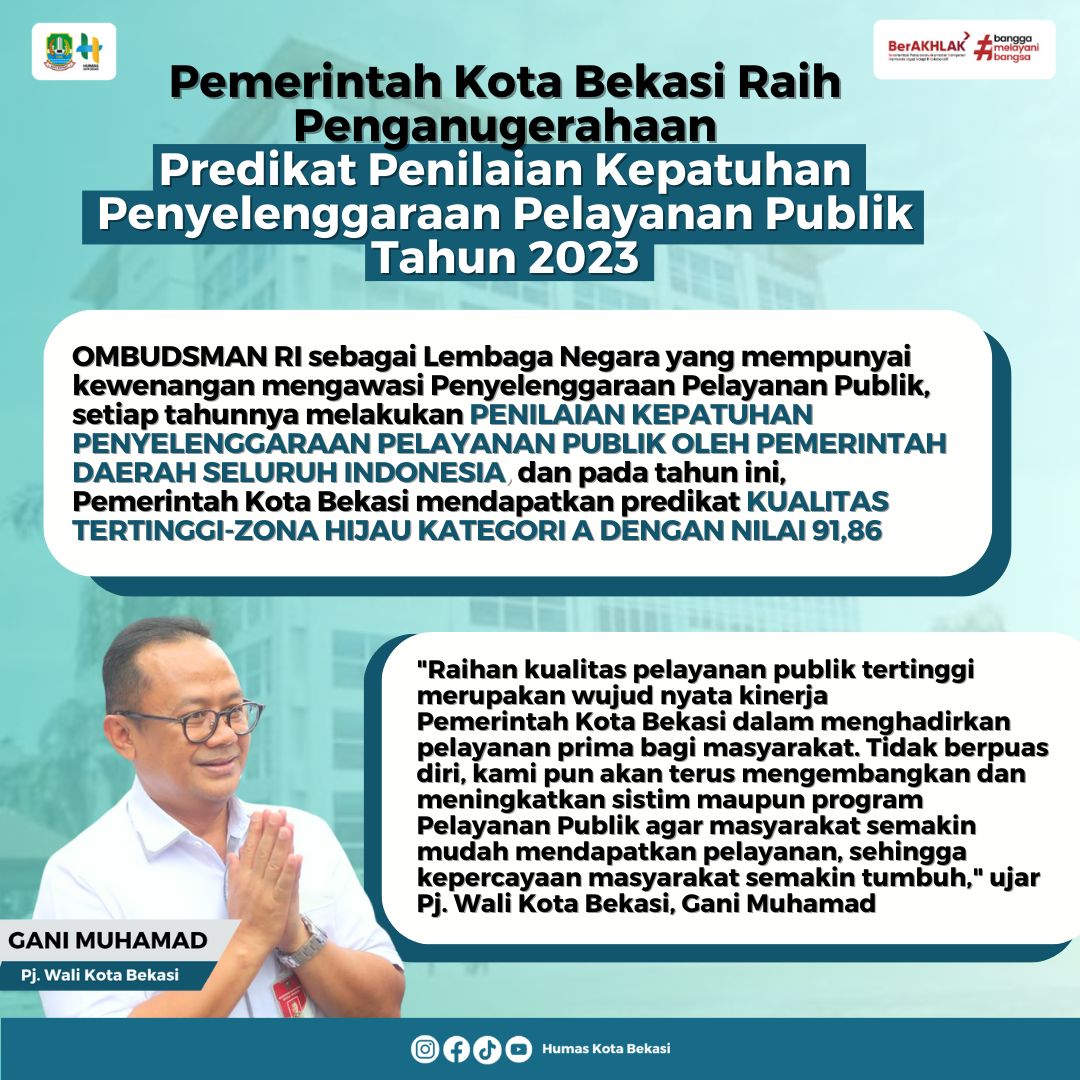 Pj. Wali Kota Bekasi, Gani Muhamad menuturkan bahwa hal tersebut merupakan sebuah raihan membanggakan bagi Pemerintah Kota Bekasi dan penghargaan tersebut khusus dipersembahkan bagi seluruh masyarakat guna menghadirkan pelayanan yang cepat, mudah, dan prima.