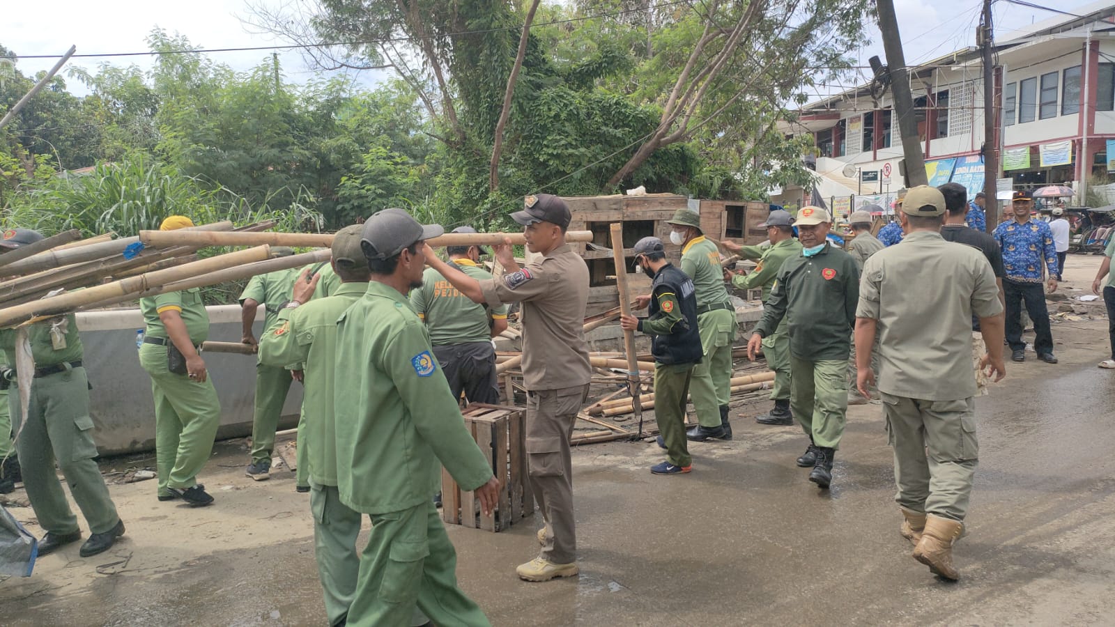 Kota Bekasi – Camat Medan Satria beserta Jajaran dan Instansi terkait melakukan penertiban Bangunan Liar (Bangli) di beberapa titik lokasi antara lain di sisi saluran dan jalan Pangeran Jayakarta, Jalan Kalibaru Timur, Sisi Saluran di Kp. Pintu Air dan Bantaran Kali Kapuk (depan Pasar Family).